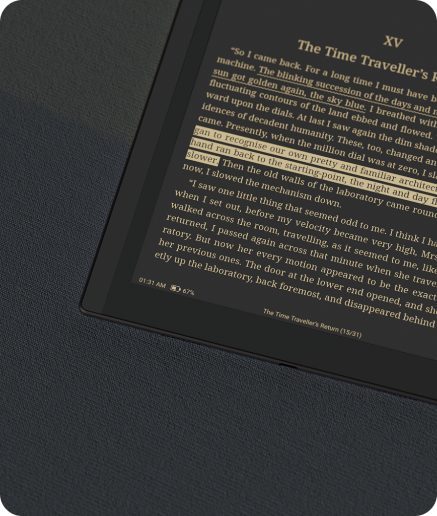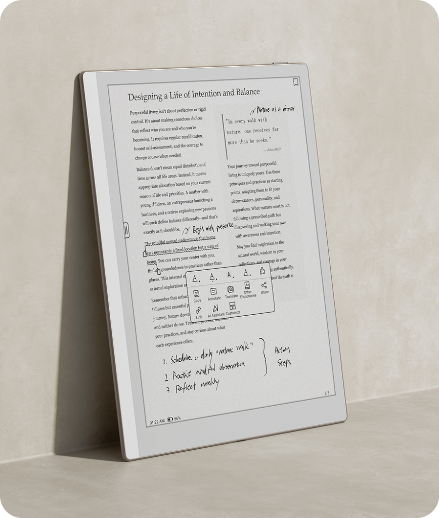 With 64GB storage and support for 26 digital formats⁶, you can carry thousand of books without hassle. Read and annotate easily with EPUB, PDF, AZW3 and more files.