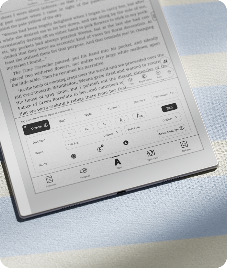 Craft your perfect focus with the built-in reader app, NeoReader. Effortlessly tailor your fonts, spacing, and margins to suit your surroundings. Switch to Dark Mode⁷ for evening reflection or a quiet night in a new city.