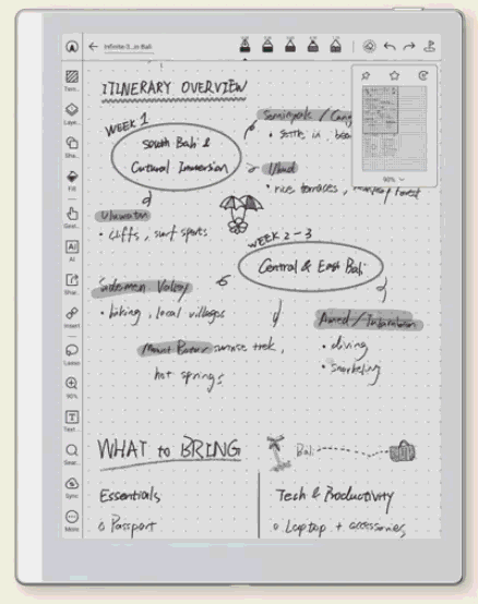 Structure notes with outlines, categorize with tags, and convert handwriting to text using the lasso tool. Connect essential travel details in one with Insert tool.